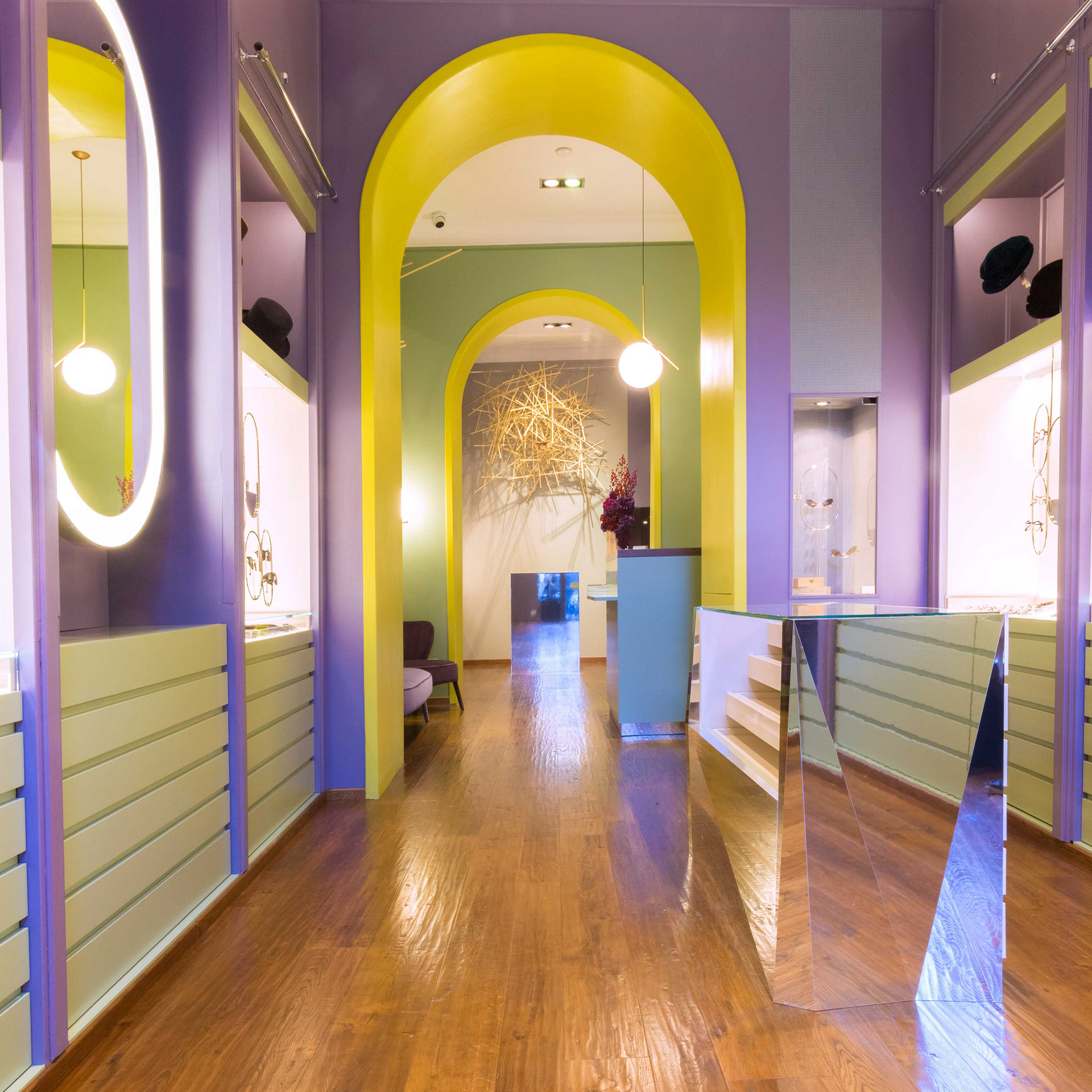 Two showcases have become a reference point for those who love the Mondelliani style, sophisticated and international. A microcosm that embodies research in everything it offers, alongside eyewear, exclusive accessories that create new trends. Showcases that become a stage for artists, painters, or sculptors who, month after month, tell a story.